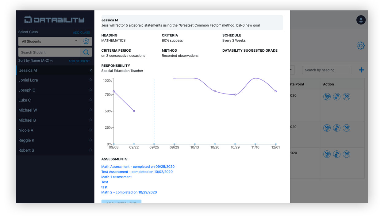 The great thing about Datability is how easy it is to track the students’ progress. Once the above data has been added to their profiles, teachers can pull a report and receive a graph indicating progress levels. It’s also possible to download a PDF of the report and send it directly to the email address of the parent or teachers. Data can be exported to match certain time periods, and you can see an overview of all the goals’ progress or just one goal at a time.