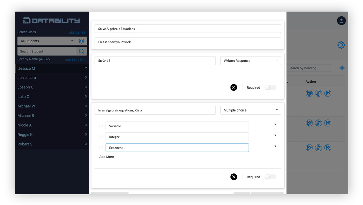Datability takes things one step further and offers special needs learners the opportunity to take virtual assessments. Teachers can start the assessment by selecting a student goal and adding the assessment. Teachers have the option of combining assessments to include written responses, multiple choice, and checklist questions. Once the assessment has been sent, the student will receive it in their email, answer the questions and submit back to the teacher. When the answers have been received, teachers are able to link the assessment to data points associated with the student and keep track of their progress.